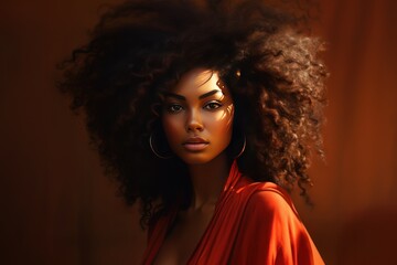 African beautiful woman portrait. Brunette curly haired young model with dark skin and perfect smile.