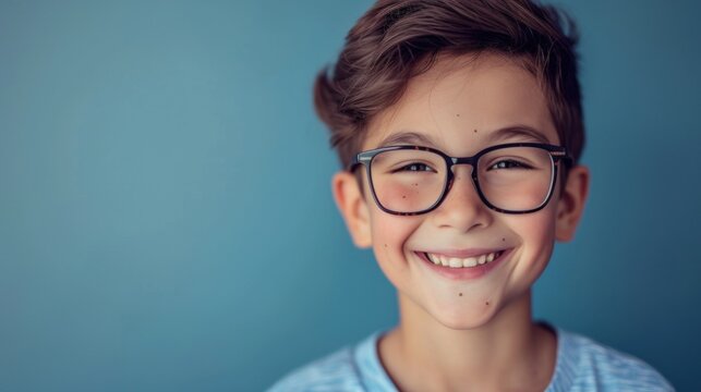 Smiling young boy with glasses against blue background.