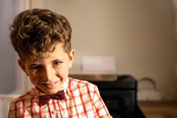 Cute preteen boy with curly brown hair in checkered shirt and bow tie in light room looking at camera