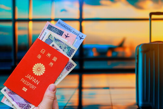 Mature couple embracing on beach with backpack and floating global currencies for travel