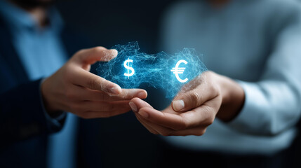 Neon currency exchange hud showing dollar to euro digital transfer visualization