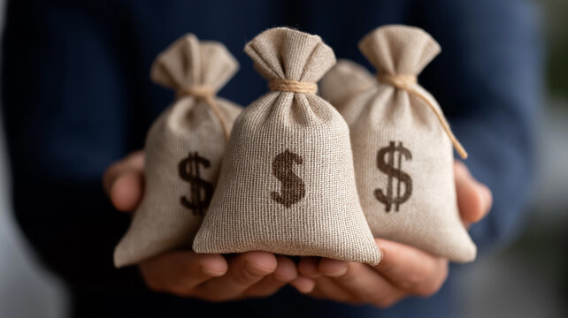 Realistic Wealth Management Scene with Hands Holding Burlap Bags Embossed with Bright Currency Signs, Golden Light, and Futuristic Digital Finance Charts Representing Prosperity and Economic Growth