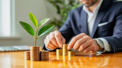 Growing Money and Investment Concept, Plant on Coins with Businessman Stacking Coins for Finance and Savings