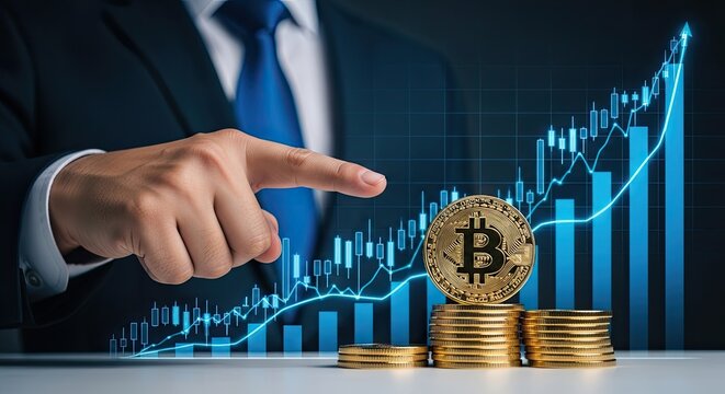 Bitcoin cryptocurrency with upward trending chart and businessman hand pointing, representing the increasing value and investment opportunity in digital currency