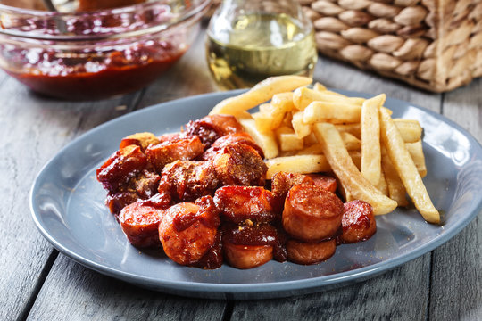 Appetizing fried pork sausage pieces with curry ketchup