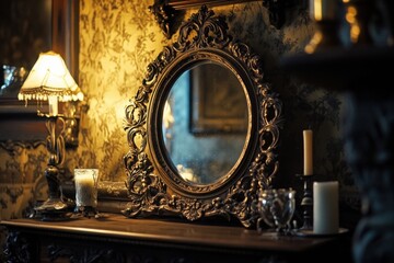 Haunted antique mirror on a table, with copy space