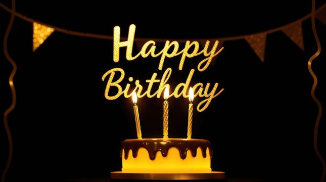Elegant birthday cake with white frosting, golden sprinkles, and a glittery “Happy Birthday” topper, perfect for festive celebrations and parties. AI generated.