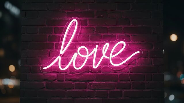 A vibrant pink neon "love" sign illuminates a dark brick wall, evoking urban romance