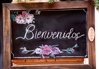 Cartel Bienvenidos. Palabra Bienvenidos escrita en una pizarra cartel con tizas de colores. Pizarrón con escritura de bienvenida en un local comercial.  Ornamentos de flores sobre pizarra negra.