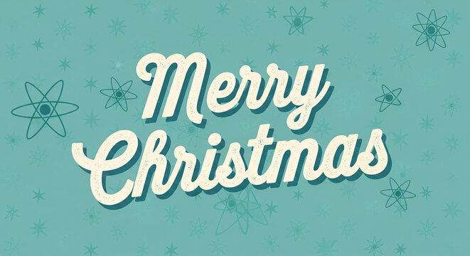 Vintage retro Merry Christmas greeting in cursive text on teal background with atomic starbursts and snowflakes
