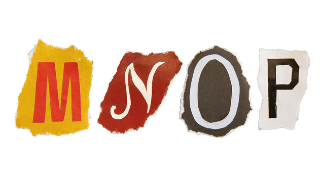 M, N, O and P alphabets on torn colorful paper . Ransom note style letters.