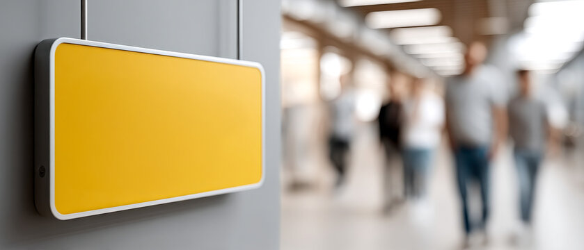 A blank yellow rectangular sign hangs indoors, with a blurred background of people walking in a hallway or corridor.