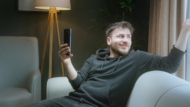Young man having a video call on smartphone while relaxing on a sofa at home