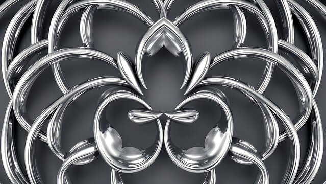 radial. Geometric pattern of curved silver metal arcs forming a flower-like shape. product launch decks, UI/UX mockups, designed for data visualization dashboards and holographic UIs.