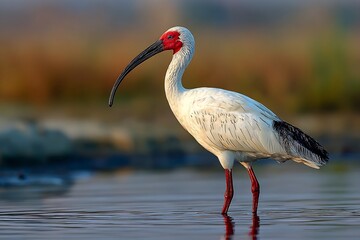 White ibis standing in shallow water with red face and long curved beak in a natural setting
