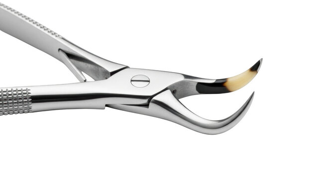 Dental extraction forceps with curved beaks and textured handles isolated on a transparent background