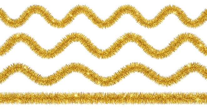 Gold tinsel garland looping on pine branch with sparkling filament tips macro