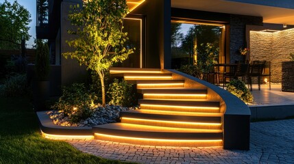 Elegant modern garden staircase at night illuminated by ambient LED lighting. Stylish design features curved steps, landscaping with plants. Exterior residence pathway leads to home entrance.