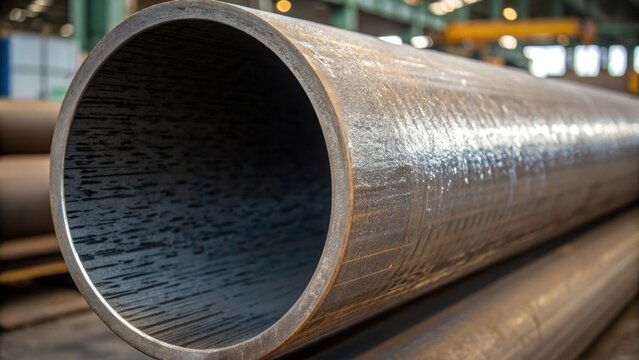 A medium closeup of a round steel pipe showing the textured surface created by mechanical processing with reflections dancing off its curved body illustrating the interplay between