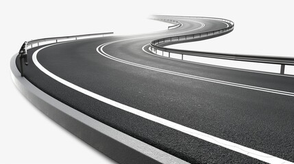 Curving racetrack with asphalt and guardrail under clear blue sky