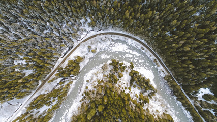 Snowy landscape showcasing tire tracks curving through fresh snow during winter, guiding towards a distant horizon