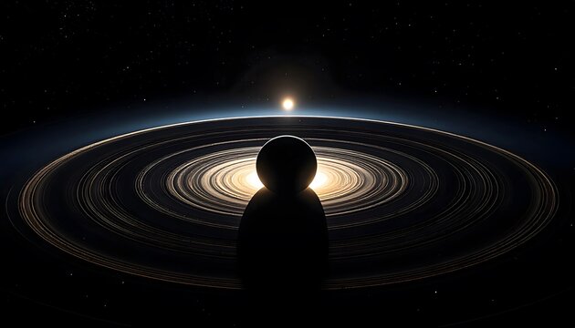 Planeta con anillos iluminado por el sol en el espacio profundo con atmósfera cósmica