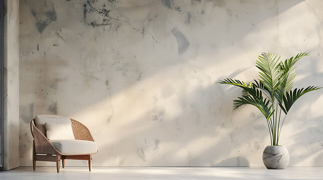 A minimalist living room with a  wicker chair, a potted plant, and a textured white wall.