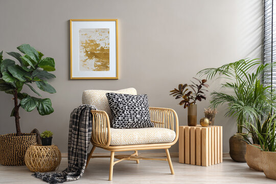 Elegant living room decor featuring a rattan armchair with patterned cushions and throws surrounded by lush green plants and abstract art