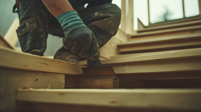 Carpenter constructing a custom wooden staircase. Featuring skill and craftsmanship