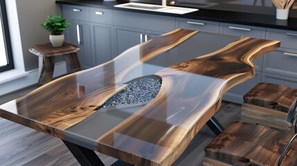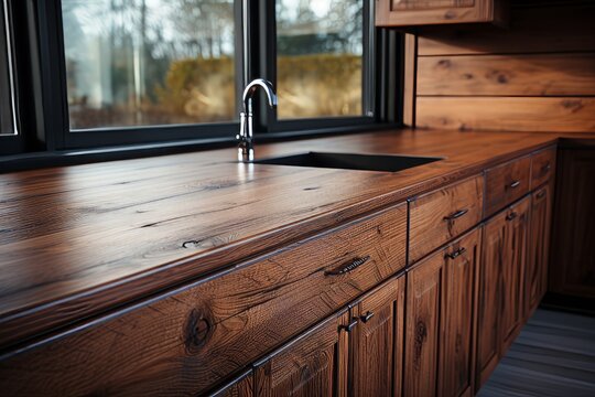 Wooden loft kitchen interior with furniture