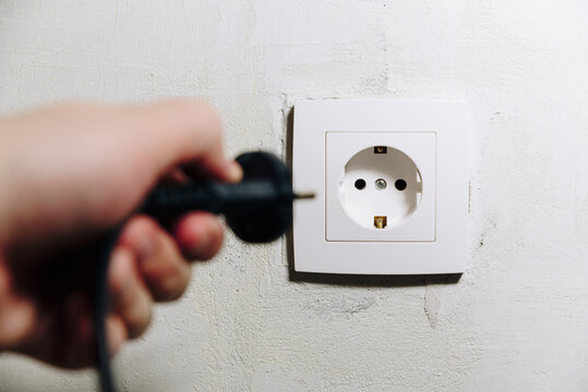 A young girl inserts a plug into an outlet. Young woman plugs the phone charger into the socket.