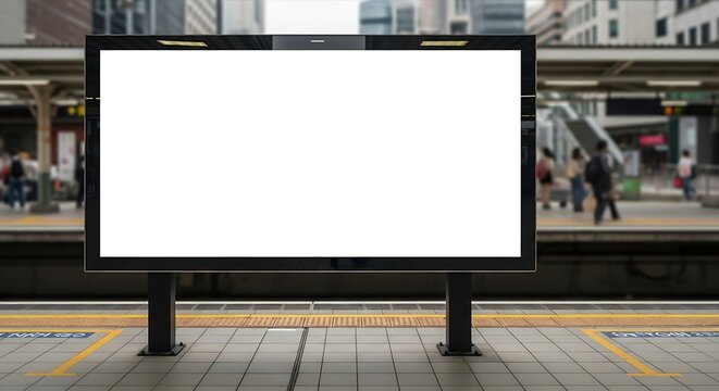 A prominent blank digital billboard stands on a bustling train station platform, offering a clear space for custom content