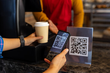 Customer paying with qr code on smartphone screen NFC payment technology at coffee shop.