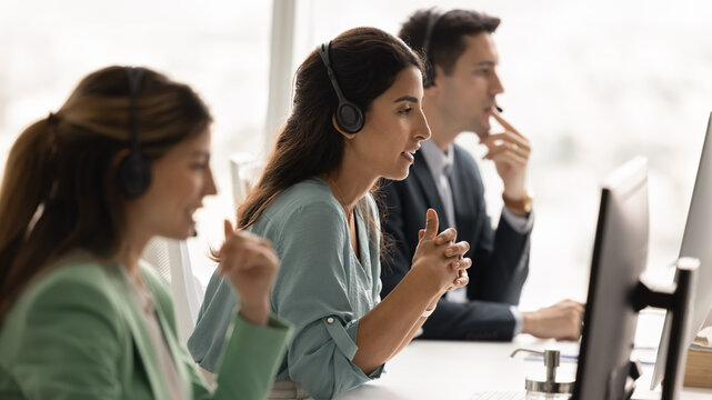 Customer service agents communicating with headsets in modern call center