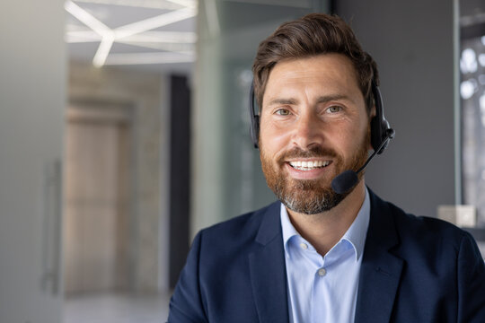 Portrait of a male customer service representative smiling and wearing a headset