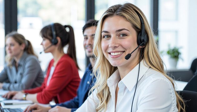 Customer support team: A professionals in an office, wearing headsets and utilizing technology to provide excellent customer service, emphasizing effective communication and support