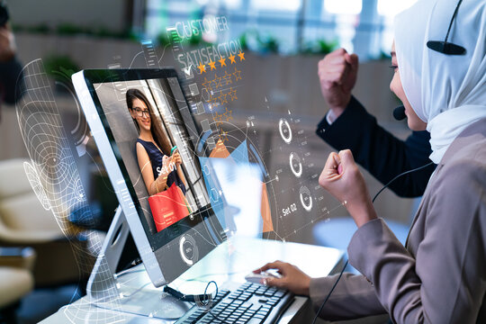 Successful Muslim customer service agent in hijab celebrating high sales and 5-star rating on futuristic AI hologram interface.