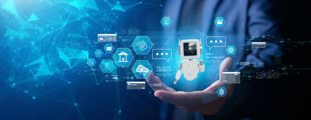 Digital customer service agent concept. Live chat support system with online communication, virtual assistant, chatbot, AI automation, technology for business help desk solutions. Person using laptop