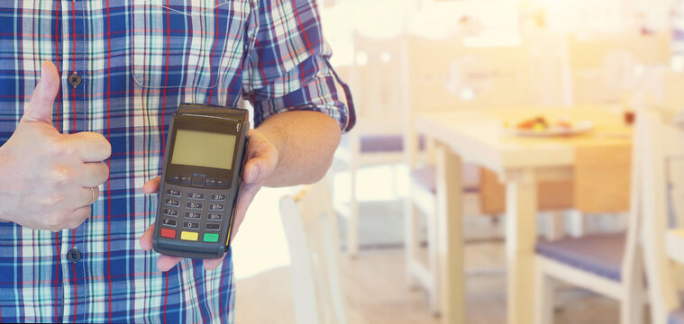 Payment terminal with NFC system. Client using credit card to pay for service in cafe, closeup