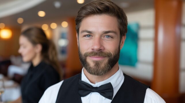 Smiling caucasian male waiter in formal attire at upscale restaurant