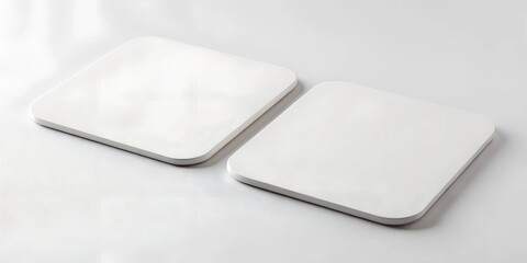 Minimalistic mockup of two square white blank coasters on a light surface. Perfect for showcasing logo or branding design. Clean and simple presentation for product promotion.