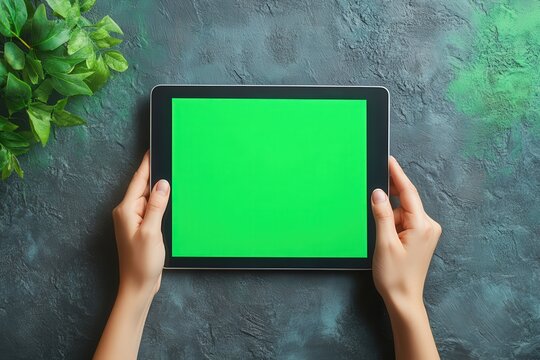 Hands holding a tablet with a vibrant green screen on a textured surface.