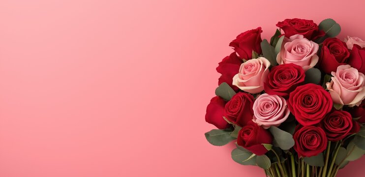 Vibrant red and pink roses arranged in a lovely bouquet, symbolizing love and romance with ample customizable text space