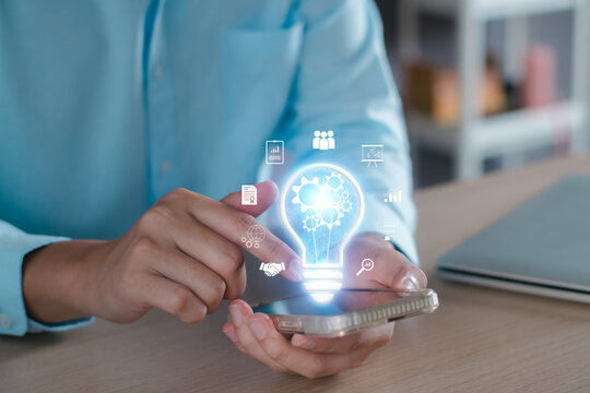 Business solution idea concept. Businessman  creative light bulbs with marketing network, planning strategy, analysis solution and development, modern business technology, Innovative of new idea.