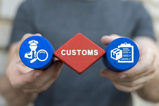 Man holding multi-colored blocks sees word: CUSTOMS. Concept of customs. Customs declaration clearance. Customs registration. Cargo delivery, import and export.