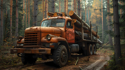 A tree stump with cut logs being loaded onto trucks for a paper mill, Papermaking raw materials, resource extraction