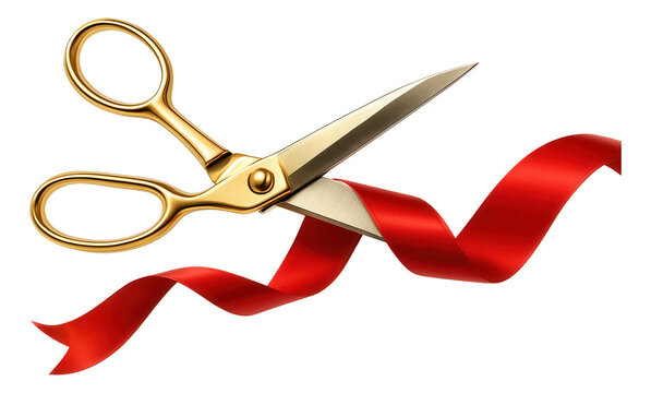 white background with gold scissors and red ribbon for celebration or event