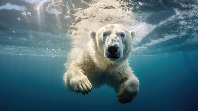 Action closeup of polar bear with big paws swimming undersea with bubbles under the water surface in a wildlife zoo aquarium - Concept of dangerous climate change, endangered wild animals