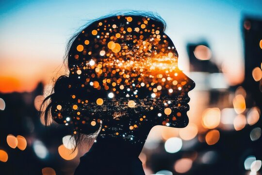 The image of a dreamy, cute woman in meditation outdoors with closed eyes is combined with a photograph of nature at sunrise or sunset, symbolizing the power of the mind