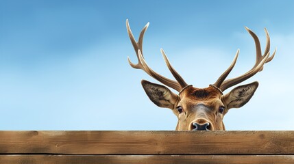 A deer peeks out from behind a wooden fence close-up. Banner, copyspace.